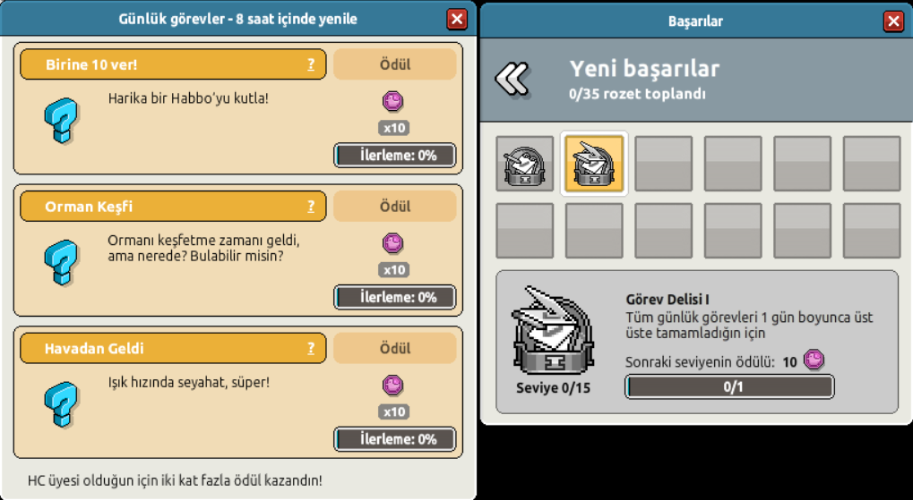 Eklenen bu başarımlar Habbo'nun günlük görevleri yapılarak kazanılabilir!
